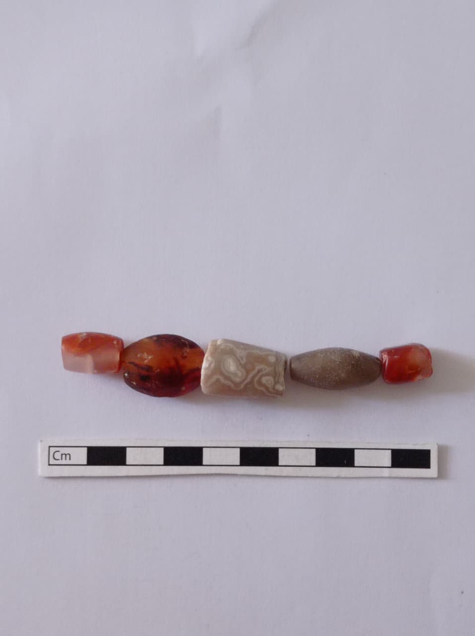 Onlardan biri süd rəngli olub, üzərində maraqlı həndəsi təsvir vardır. Lakin bu təsvir insan əməyinin məhsulu deyil, daşın təbii quruluş və kəsim xüsusiyyətindən irəli gəlir. Digər muncuq çəlləkvari formada olub boz rənglidir. Qalan üç muncuq isə açıq qırmızı rəngli və çəlləkvari formadadır.
